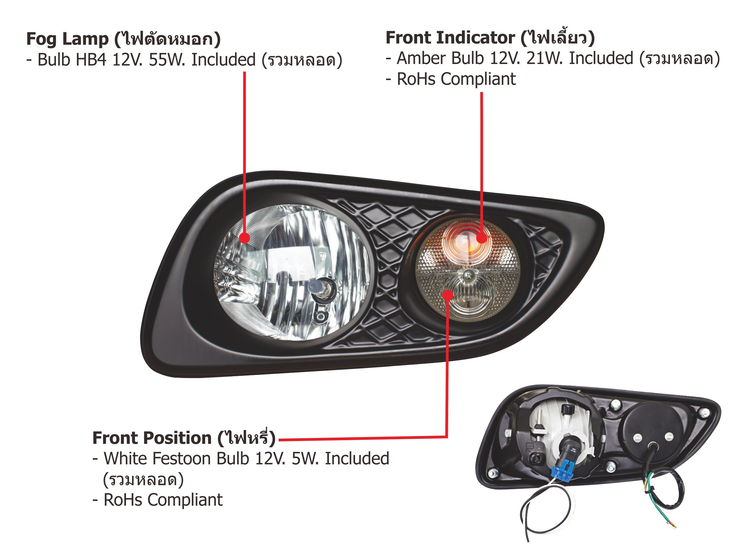 | ชุดไฟตัดหมอกพร้อมเบ้า | | | | | ไฟตัดหมอก | : หลอด HB4 12V. 55W.(รวมหลอด) | | ไฟเลี้ยวหน้า | : หลอดเหลือง 12V 21W.(รวมหลอด) | | ไฟหรี่ | : หลอดขาว 12V 5W.(รวมหลอด) | | เบ้า | : พลาสติกดำล้วน หรือดำตัดโครเมี่ยม |