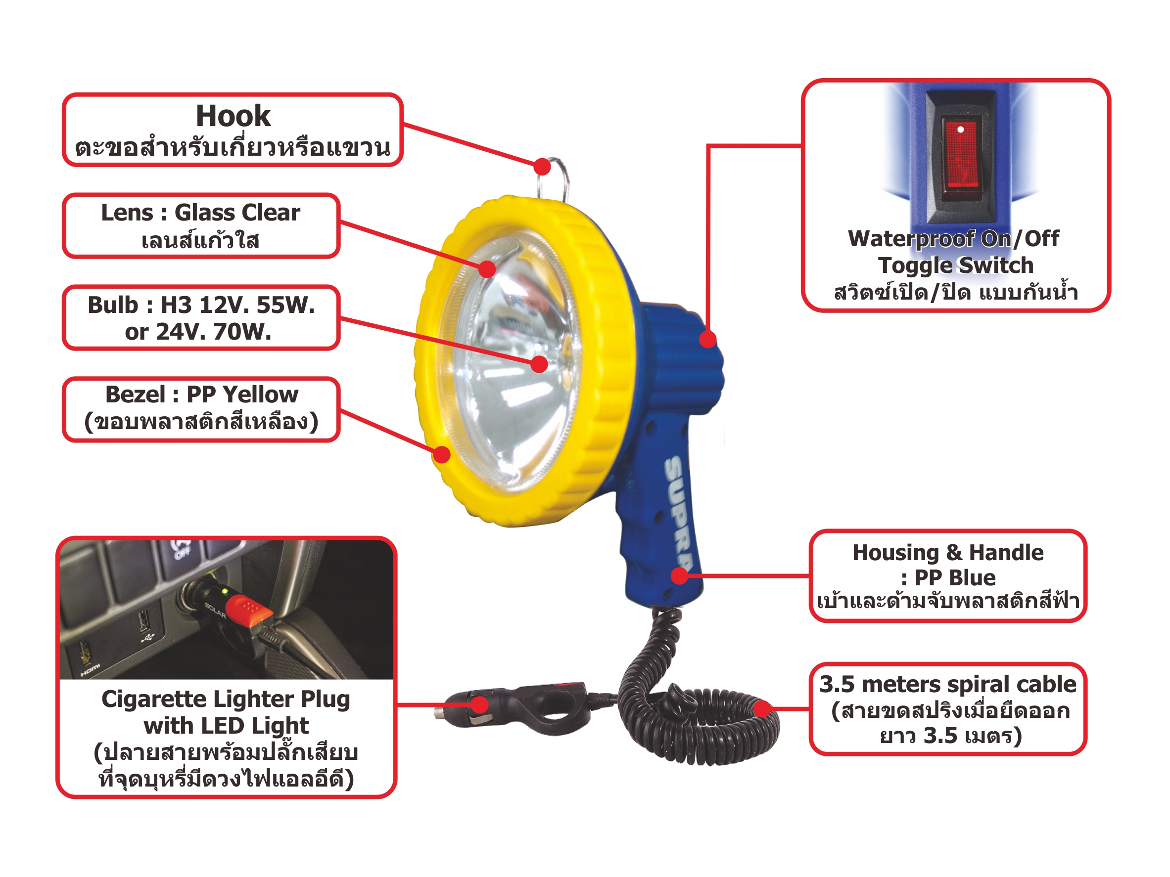 | โวลต์ | : H3 12V. 55W. หรือ 24V. 70W. | | เลนส์ | : แก้ว | | เบ้าและด้ามจับ | : พลาสติก PP สีฟ้า | | ขอบ | : พลาสติก PP สีเหลือง | | สายไฟ | : สายขดสปริงเมื่อยืดออกยาว 3.5 เมตร พร้อมปลายสายปลั๊กเสียบที่จุดบุหรี่มีไฟแอลอีดี |