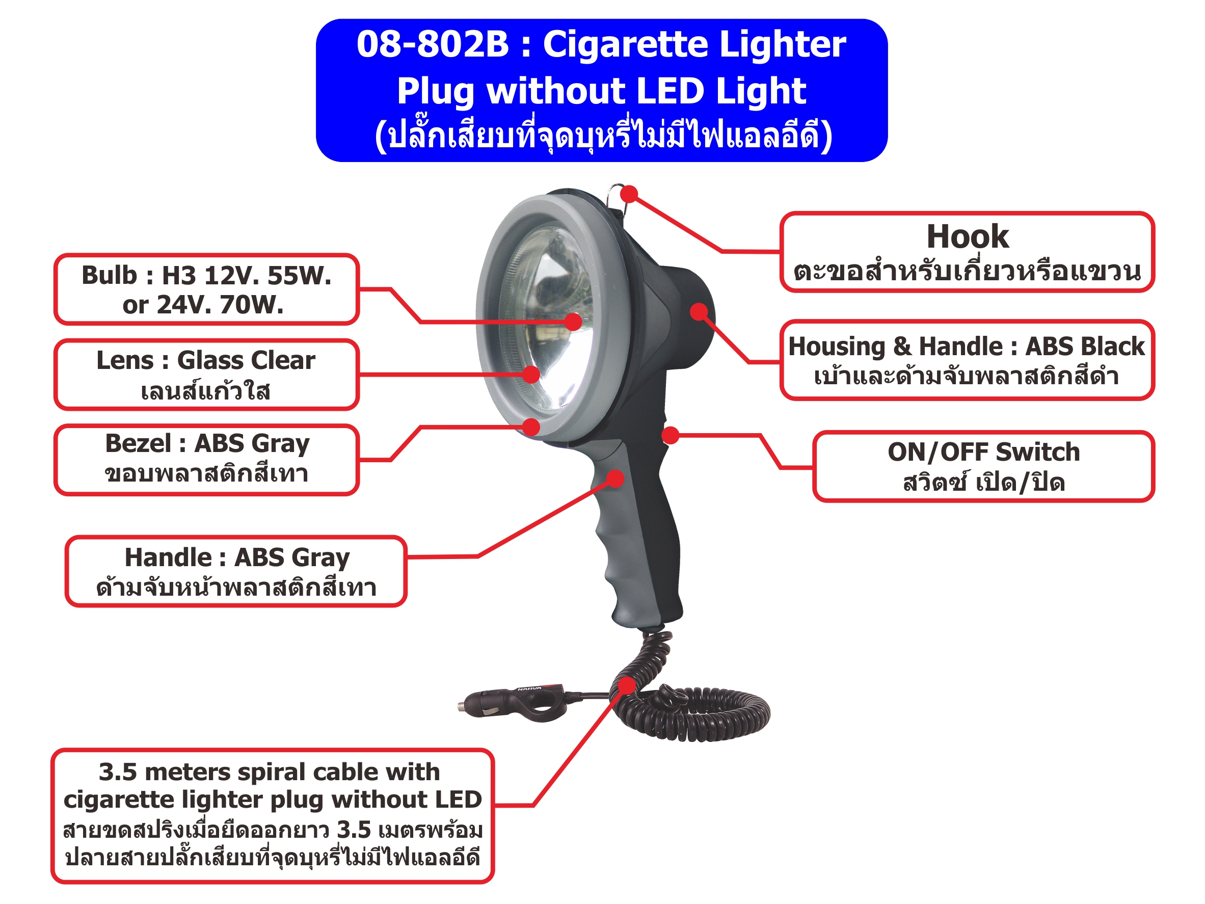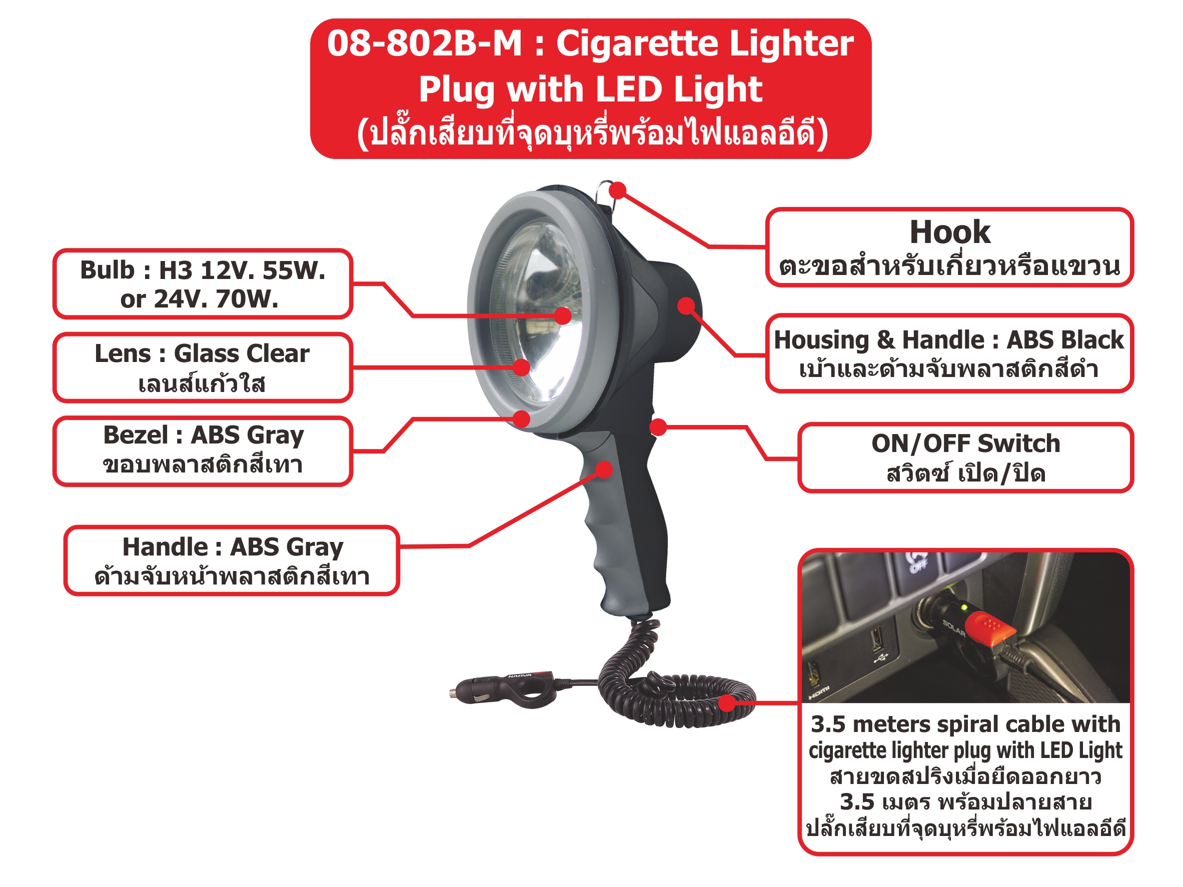 : สายขดสปริงเมื่อยืดออกยาว 3.5 เมตร พร้อมปลายสายปลั๊กเสียบที่จุดบุหรี่มีไฟแอลอีดี