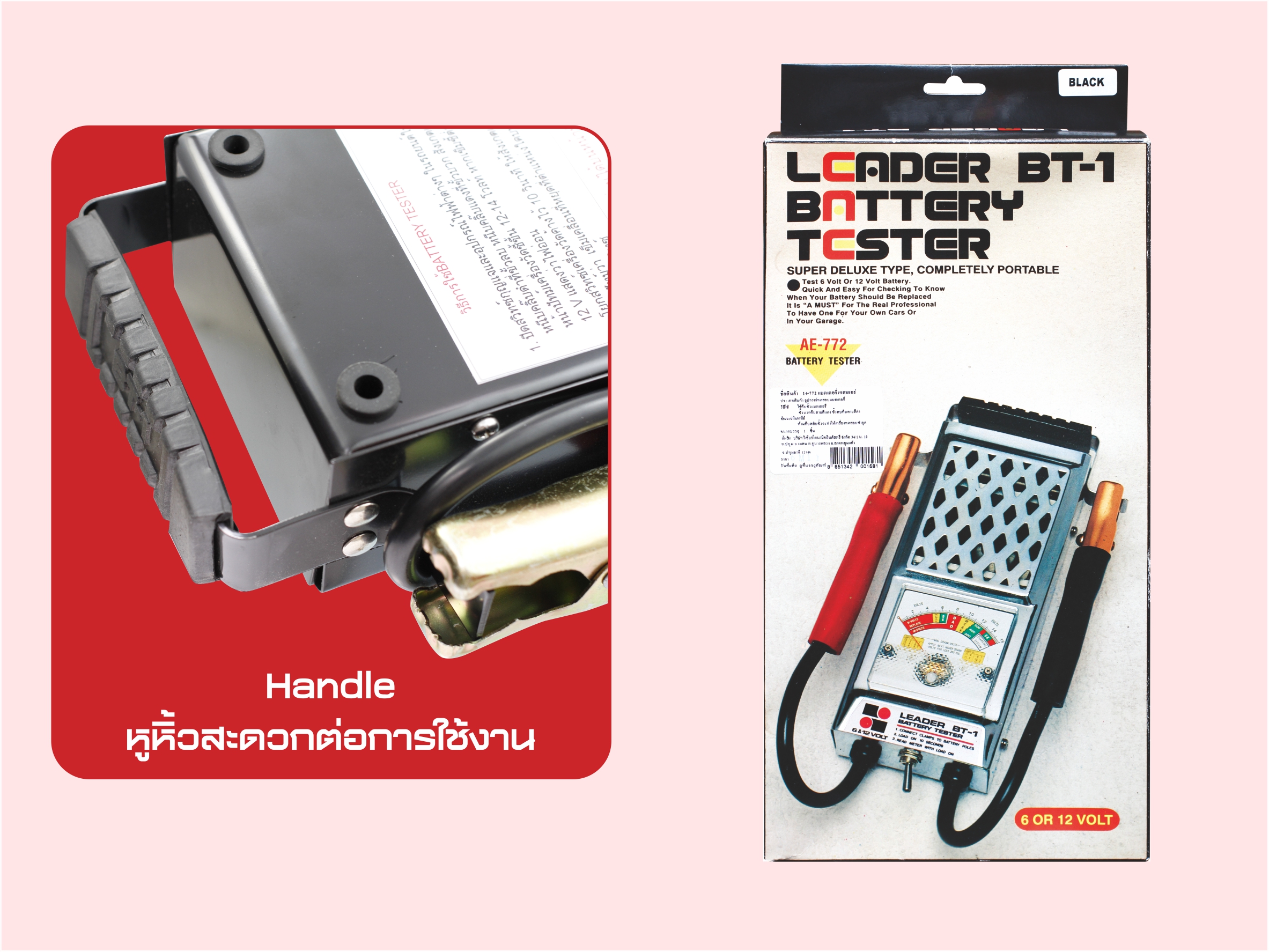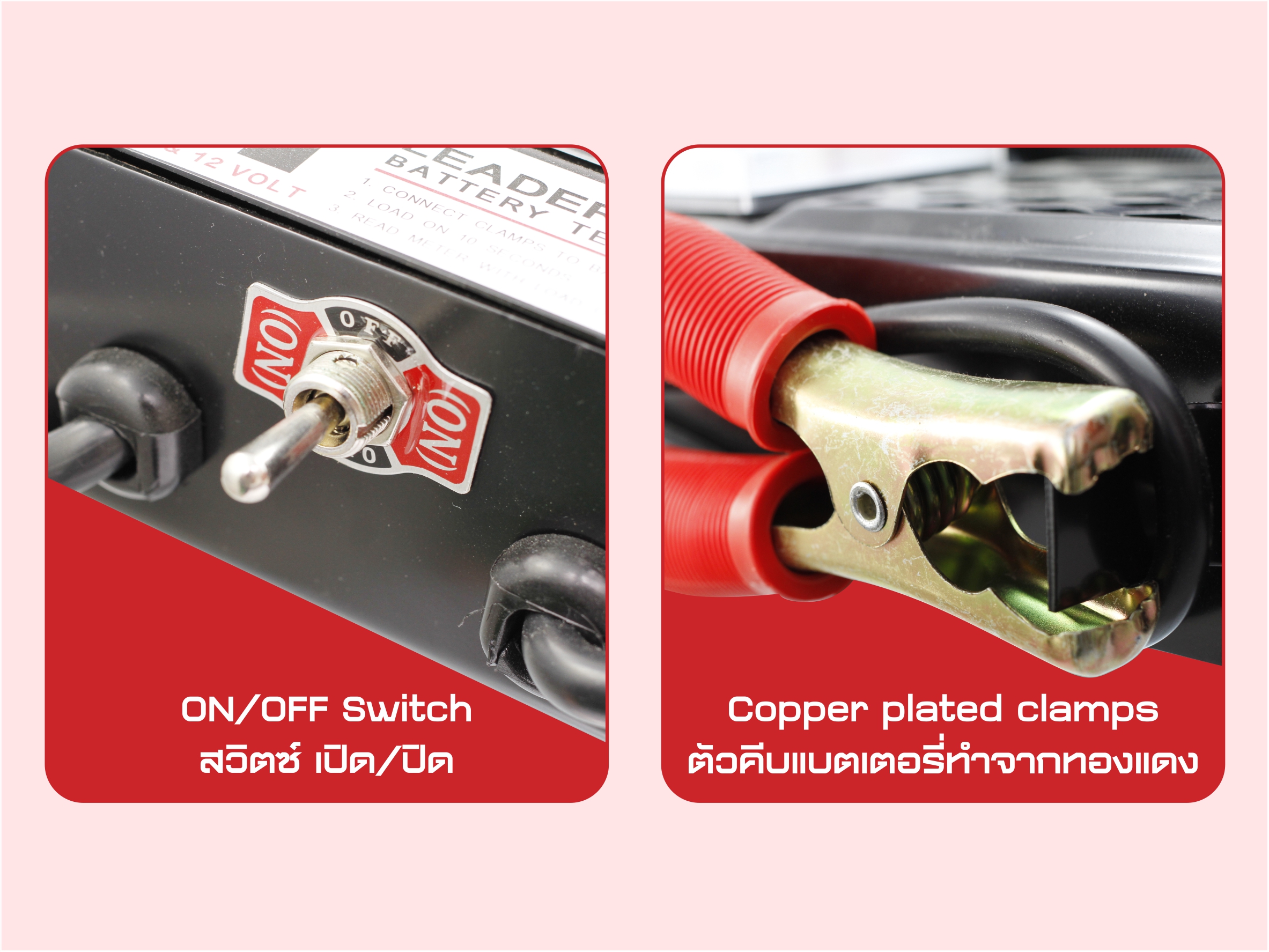 | เครื่องทดสอบแบตเตอรี่ | | | - ตัวคีบแบตเตอรี่ทำจากทองแดง | | - ใช้ทดสอบแบตเตอรี่ 6 โวลต์และ 12 โวลต์ | | - กล่องครอบแบตเตอรี่เบ้าโครเมี่ยมและดำ |