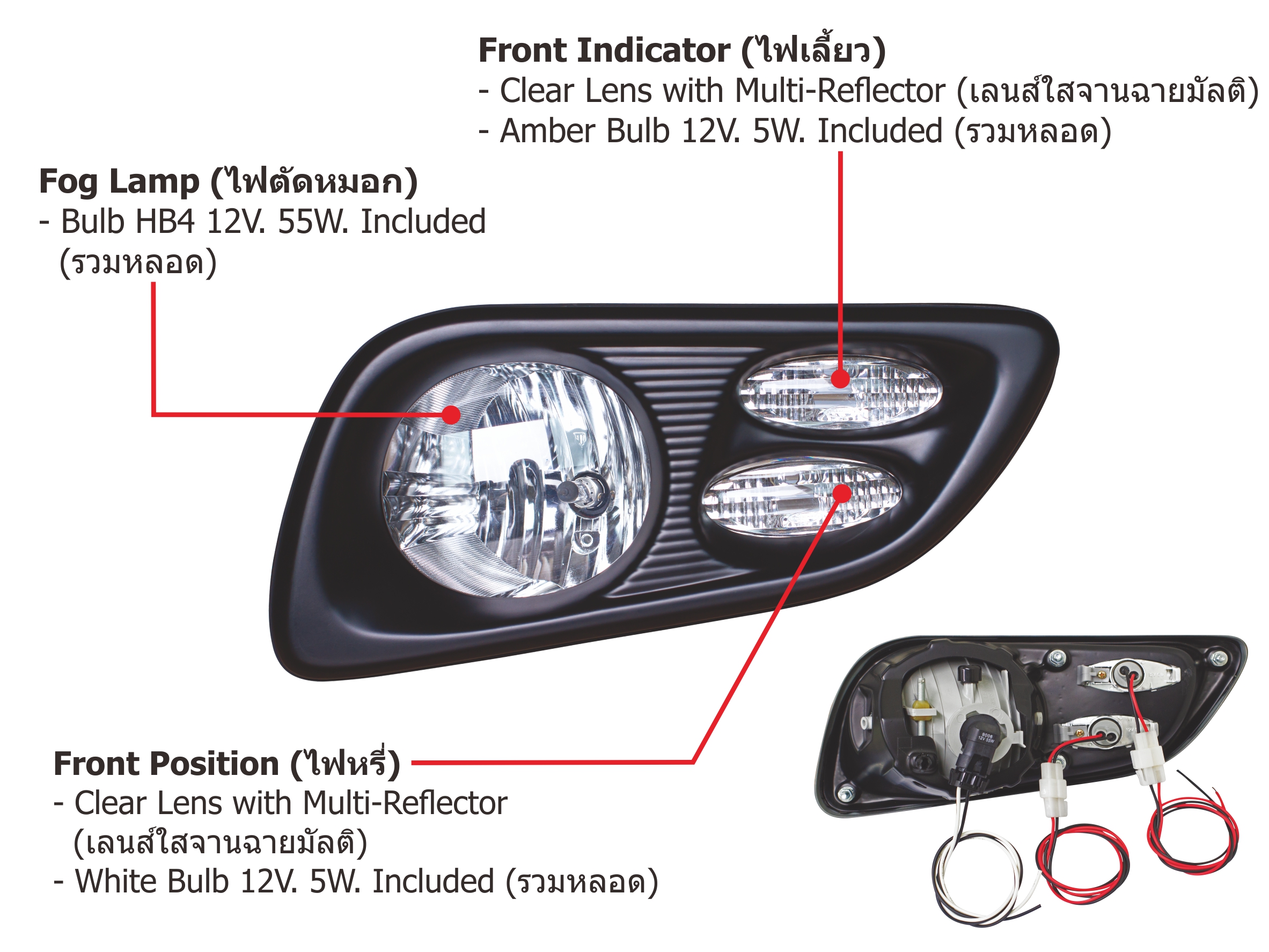 | ชุดไฟตัดหมอกพร้อมเบ้า | | | | | ไฟตัดหมอก | : หลอด HB4 12V. 55W.(รวมหลอด) | | ไฟเลี้ยวหน้า | : หลอดเหลือง 12V 5W.(รวมหลอด) | | ไฟหรี่ | : จานฉายมัลติ, หลอดขาว 12V 5W.(รวมหลอด) | | เบ้า | : พลาสติกดำล้วน หรือดำตัดโครเมี่ยม |