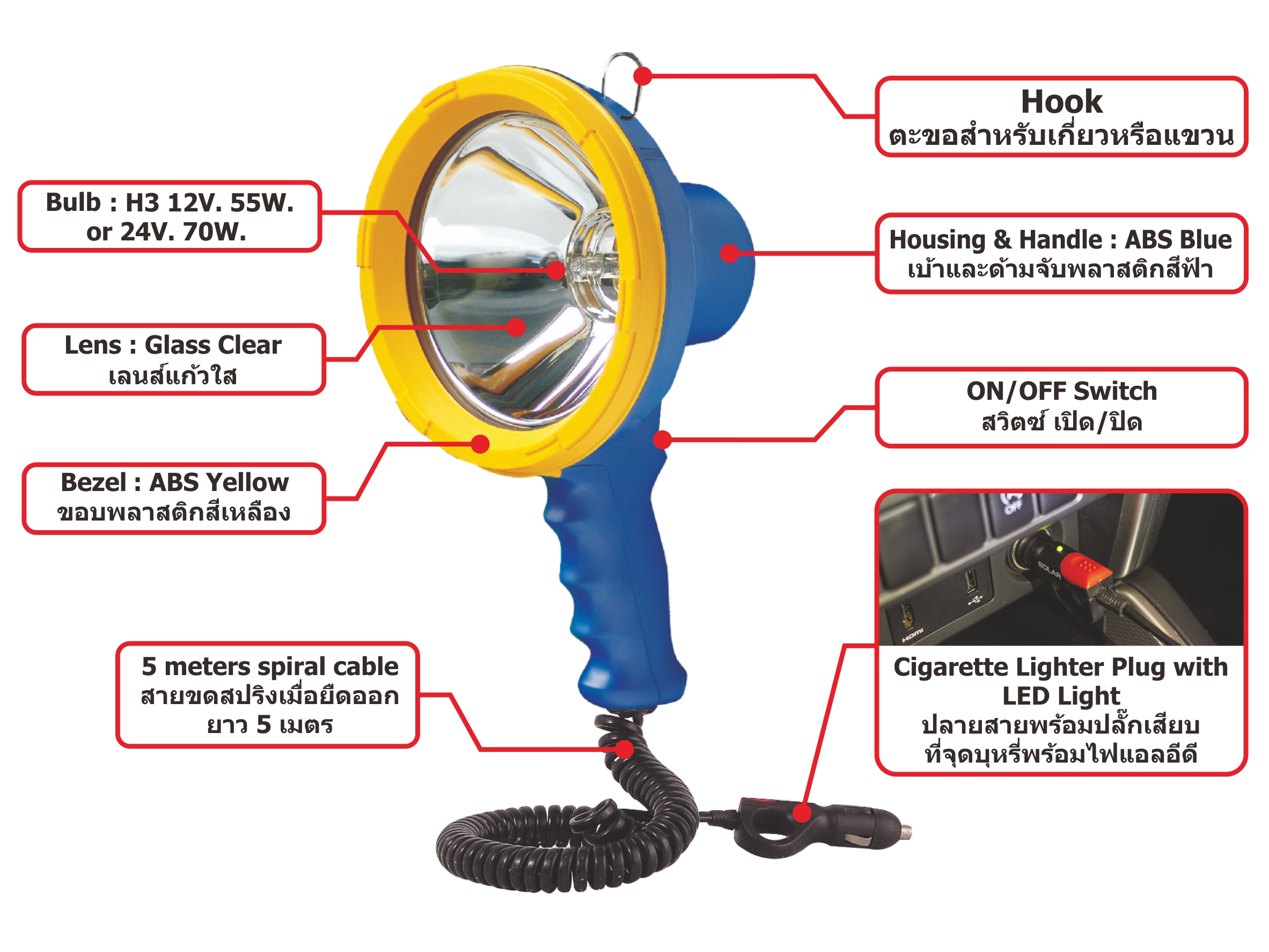 : สายขดสปริงเมื่อยืดออกยาว 5 เมตร พร้อมปลายสายปลั๊กเสียบที่จุดบุหรี่มีไฟแอลอีดี